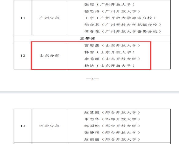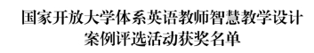 近日,国家开放大学体系英语教师智慧教学设计案例评选活动获奖名单揭晓,我校文法教学部教师曹海燕、韩雪、李秀丽、杨洁获得三等奖,直属学院李一晨和临沂开大徐芳、王春雨、申叶红获得优秀奖,同时我校获得组织奖。